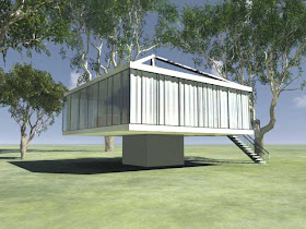この絵を作ったきっかけはミース設計のファンズワース邸だ。イリノイ州の湿地帯に建っており、しばしば洪水に見舞われる。ミースは設計するにあたり1階の床を1.5m地盤面より上げた設計をした。